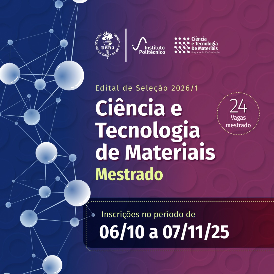 O Programa de Pós-Graduação em Ciência e Tecnologia de Materiais estará com inscrições abertas entre o dia 6 de outubro e o dia 7 de novembro de 2025, com início no 1º semestre de 2026. |