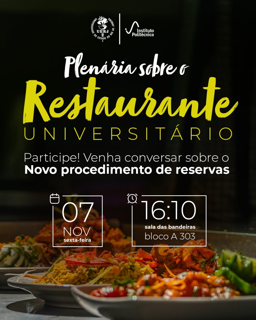 A direção do IPRJ convida a todos os usuários do Restaurante Universitário para uma plenária, na próxima sexta, às 16h10, na sala 303 do bloco A (sala das bandeiras). Na ocasião será apresentado o novo procedimento de reservas para o RU, bem como outros assuntos. Participem!